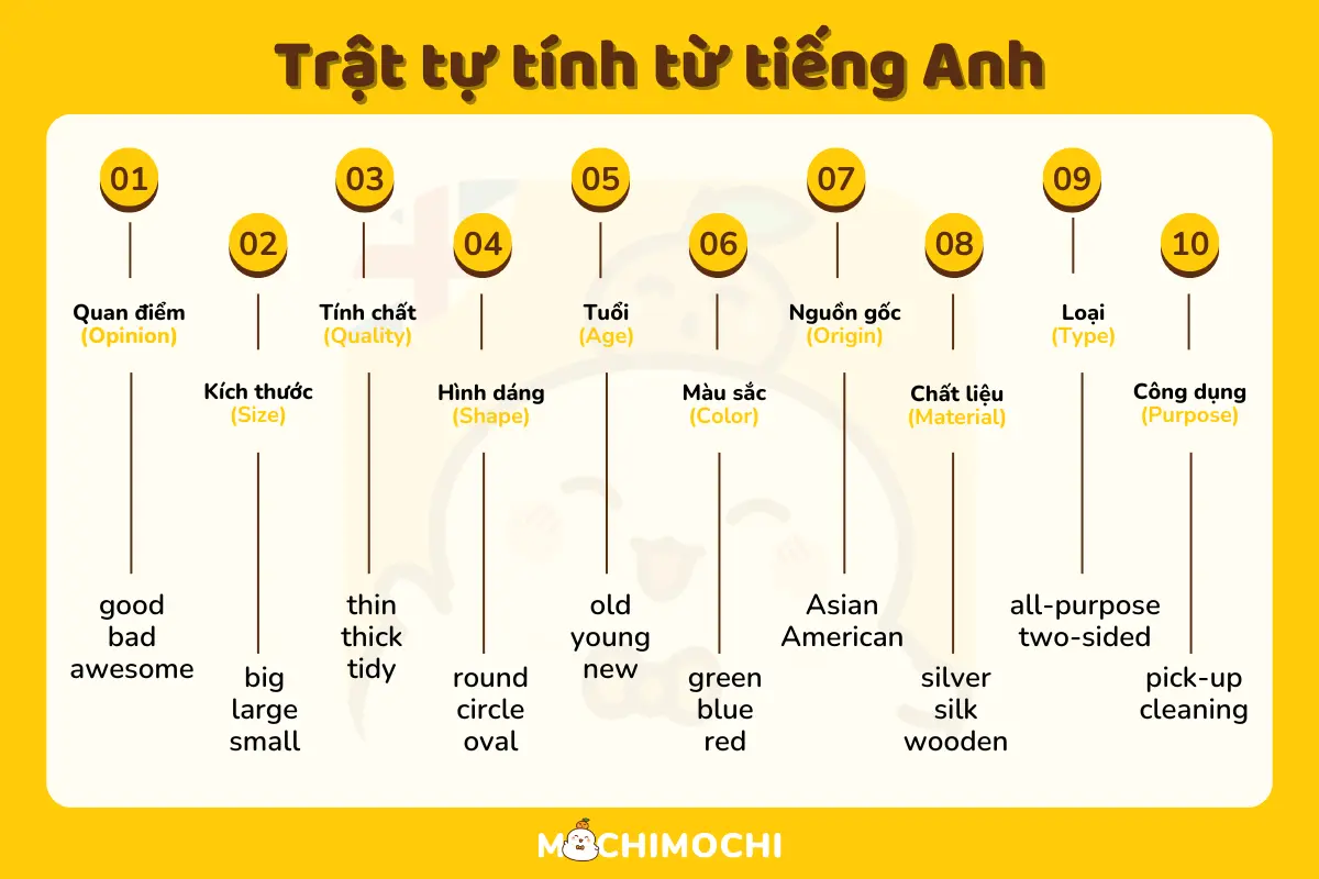 Trật tự tính từ trong tiếng Anh là một quy tắc quan trọng giúp câu văn trở nên tự nhiên và rõ ràng hơn. Quy tắc này được gọi là OSASCOMP, là chữ cái viết tắt của các loại tính từ sắp xếp theo thứ tự từ tổng quát đến cụ thể. Cách sắp xếp này bao gồm: Ý kiến (Opinion) → Kích cỡ (Size) → Tuổi (Age) → Hình dạng (Shape) → Màu sắc (Color) → Xuất xứ (Origin) → Vật liệu (Material) → Mục đích (Purpose).