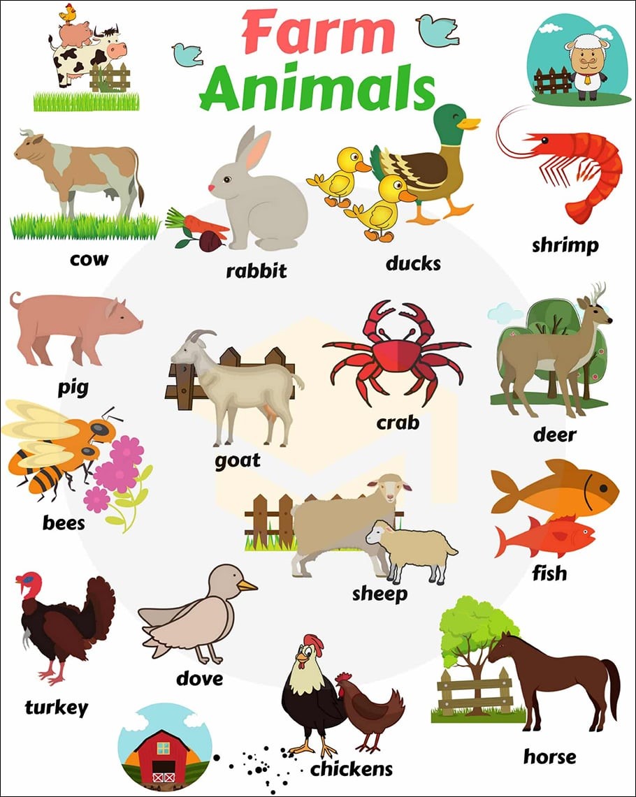 Trong thế giới động vật, có không ít loài sống hoang dã như hổ (tiger) và báo (leopard) mà nhiều người yêu thích. Bên cạnh đó, các động vật nông trại cũng rất quen thuộc, như cừu (sheep), dê (goat), và bò (cow). Các bé cũng có thể nhận biết con thỏ (rabbit) hoặc lừa (donkey) dễ dàng.
