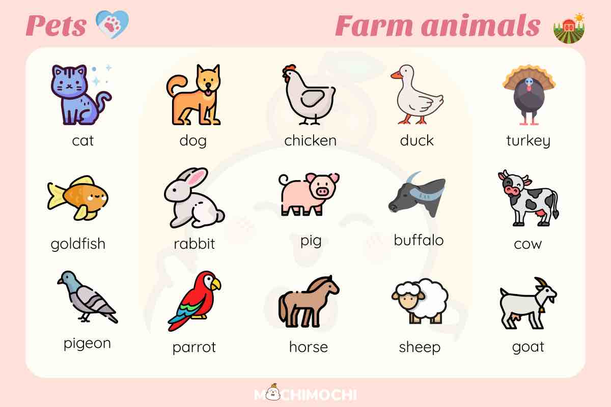 Bên cạnh đó, chúng ta không thể quên những loài vật nuôi phổ biến như chó (dog), mèo (cat) và lợn (pig). Những con vật này không chỉ làm bạn với con người mà còn được yêu quý như một phần trong gia đình, mang lại niềm vui tiếng cười cho mọi nhà.