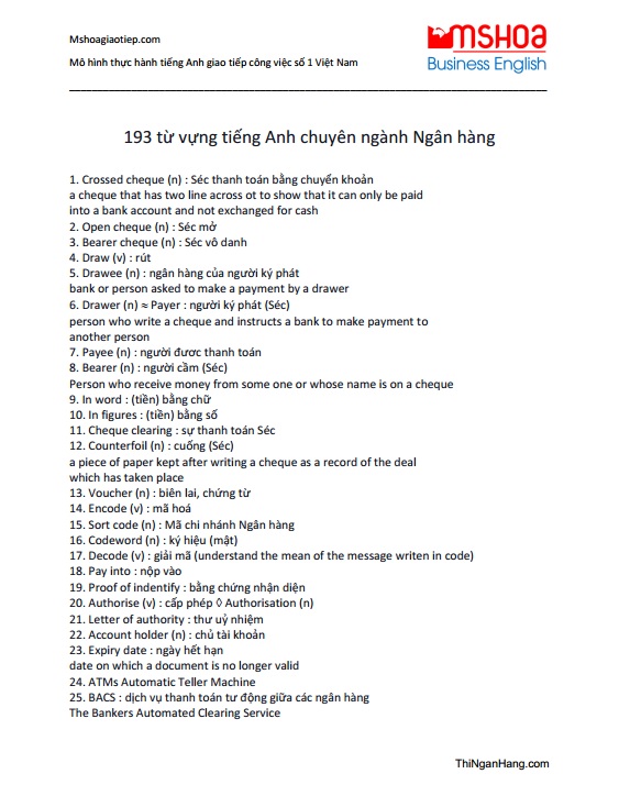 Thuật ngữ tiếng Anh chuyên ngành ngân hàng