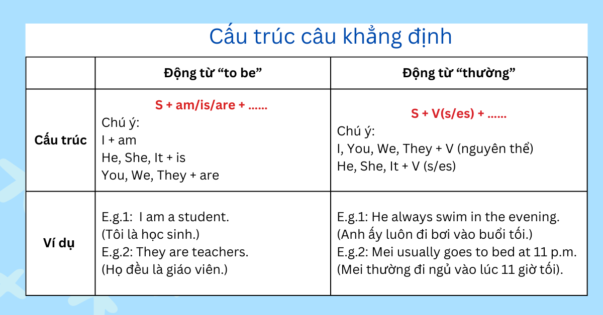 Trong các câu khẳng định, cấu trúc thường được dùng là S + V (s/es) + O. Ví dụ, “She reads a book every evening” (Cô ấy đọc sách mỗi tối) hoặc “The store closes at 10PM” (Cửa hàng đóng cửa lúc 10 giờ tối) thể hiện những thói quen hàng ngày.
