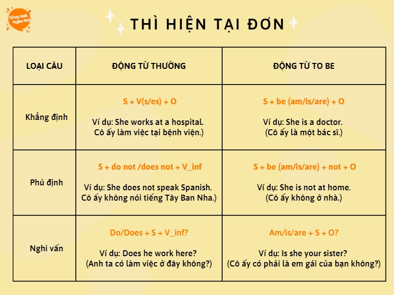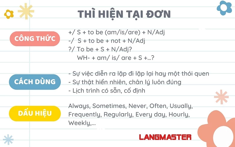 Thì Hiện Tại Đơn (Present Simple Tense) là một trong những thì cơ bản và dễ học nhất trong tiếng Anh. Nó thường được dùng để mô tả những thói quen, hành động lặp lại trong hiện tại hoặc những chân lý hiển nhiên. Công thức của thì này rất đơn giản: S + am/is/are đối với động từ to be, và S + động từ (đối với động từ thường) với một vài quy tắc chia động từ cần nhớ.