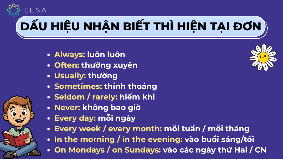 Dấu hiệu nhận biết thì này thường có các trạng từ chỉ tần suất như “always”, “usually”, “sometimes” hay “never”, giúp chúng ta dễ dàng nhận diện và ứng dụng trong giao tiếp hàng ngày. Những kiến thức này sẽ giúp bạn tự tin hơn khi sử dụng thì hiện tại đơn trong các tình huống khác nhau.