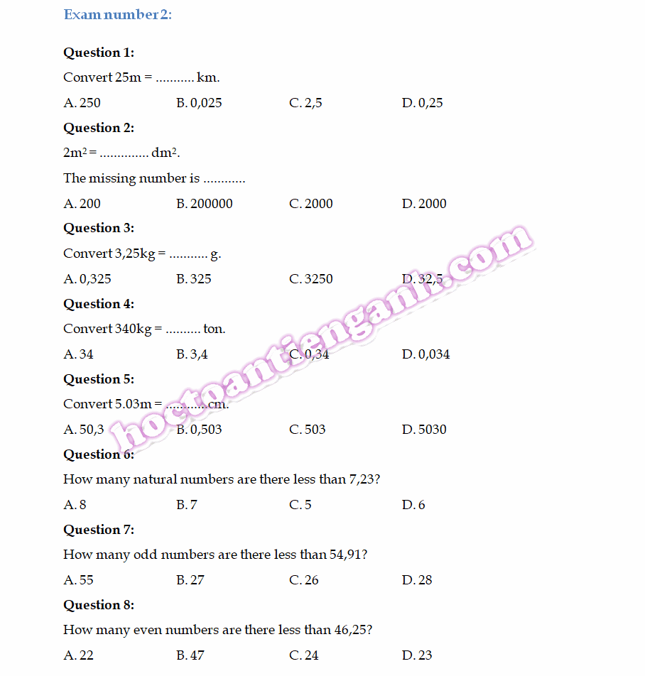 Đề thi Toán Tiếng Anh lớp 5 là một nguồn tài liệu rất hữu ích cho các em học sinh trong việc rèn luyện và củng cố kiến thức. Các đề thi không chỉ giúp các em nắm vững các kiến thức cơ bản mà còn phát triển khả năng tư duy phản biện. Mỗi bộ đề được thiết kế đa dạng với nhiều dạng bài tập khác nhau, từ đó học sinh có thể thực hành và làm quen với từng loại câu hỏi.