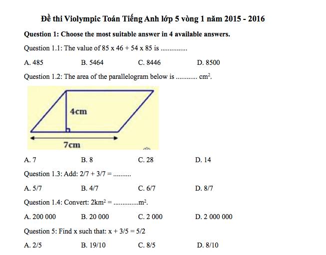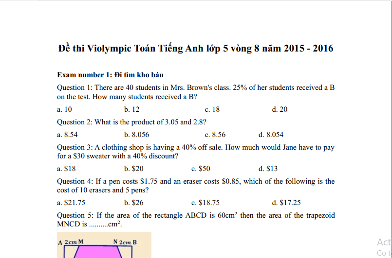 Ngoài ra, các phép tính cơ bản như phép cộng, trừ, nhân, chia cũng thường xuyên xuất hiện trong các bài tập. Việc luyện tập với các đề thi như Violympic là cơ hội tuyệt vời để các em nâng cao khả năng toán học bằng tiếng Anh. VnDoc.com cũng đã cung cấp nhiều bộ đề ôn tập, giúp học sinh lớp 5 có thêm tài liệu tham khảo hữu ích.