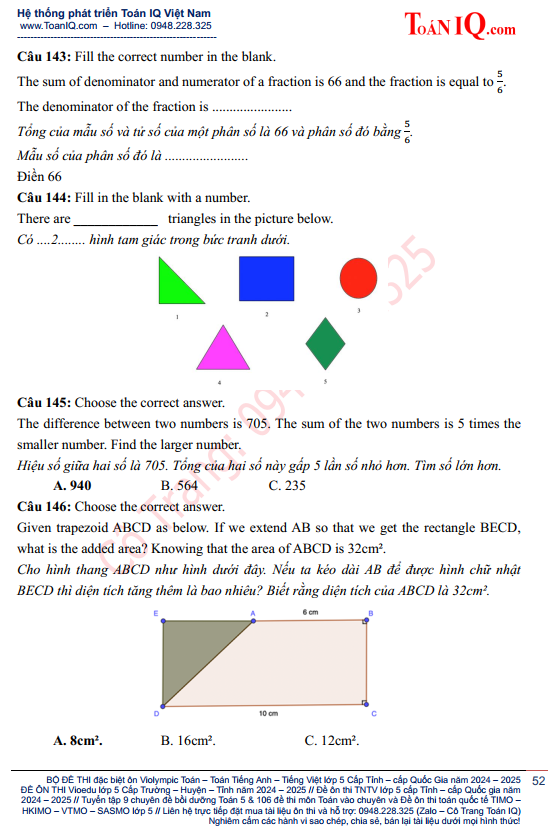 Ngoài ra, bộ sách “Tự luyện Violympic Toán bằng tiếng Anh lớp 5” cũng là nguồn tài liệu quý giá giúp học sinh ôn luyện và nâng cao khả năng giải quyết vấn đề. Các đề thi và bài tập thực hành được cập nhật liên tục, tạo cơ hội cho các em rèn luyện kỹ năng một cách hiệu quả.
