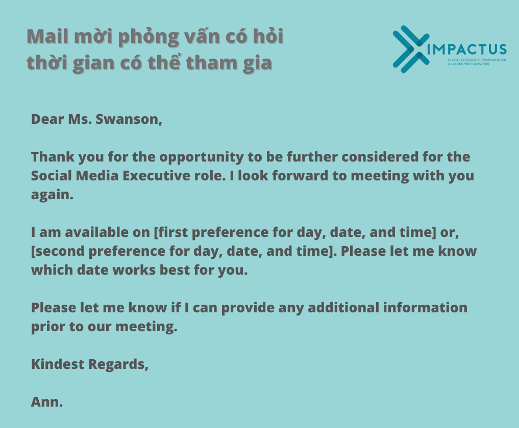 Cuối cùng, đừng quên kết thúc email bằng một lời chào ấm áp như “Looking forward to our meeting” và ký tên của bạn. Viết một email rõ ràng, mạch lạc không chỉ giúp bạn ghi điểm mà còn thể hiện sự chuyên nghiệp của bạn trong mắt nhà tuyển dụng.