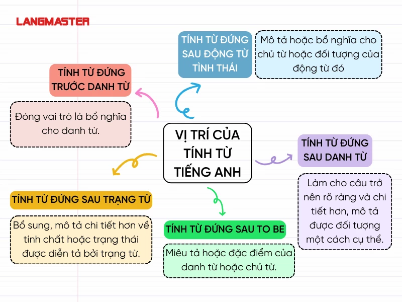 Ngoài ra, một vị trí khác của tính từ rất quan trọng là sau động từ liên kết như “to be,” “seem,” “appear,” hoặc “feel.” Ví dụ, trong câu “She is beautiful,” tính từ “beautiful” đứng sau động từ “is,” giúp nói rõ thêm về trạng thái của chủ ngữ. Điều này rất hữu ích trong việc miêu tả cảm xúc hay trạng thái của một đối tượng.