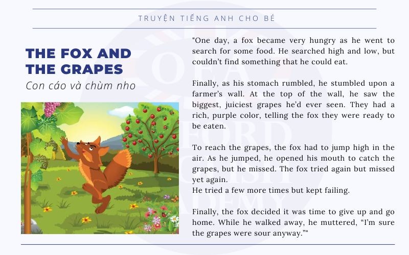Truyện tiếng Anh cho bé là một nguồn tài nguyên quý giá giúp phát triển ngôn ngữ và trí tưởng tượng của trẻ nhỏ. Những câu chuyện đơn giản nhưng đầy ý nghĩa như “The Fox and the Grapes” hay “The Tortoise and the Hare” không chỉ giải trí mà còn mang đến bài học về sự kiên nhẫn và không bỏ cuộc.