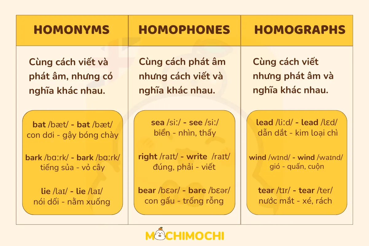 Homophones là các từ có cách phát âm giống nhau nhưng khác nghĩa, chẳng hạn như “meat” (thịt) và “meet” (gặp). Thứ hai, homographs là những từ viết giống nhau nhưng lại phát âm khác nhau. Đơn cử là từ “lead” (dẫn dắt) và “lead” (chì). Cuối cùng, true homonyms là những từ đồng âm, đồng tự mà nghĩa khác nhau, ví dụ như từ “bat” có thể là con dơi hoặc gậy đánh bóng.