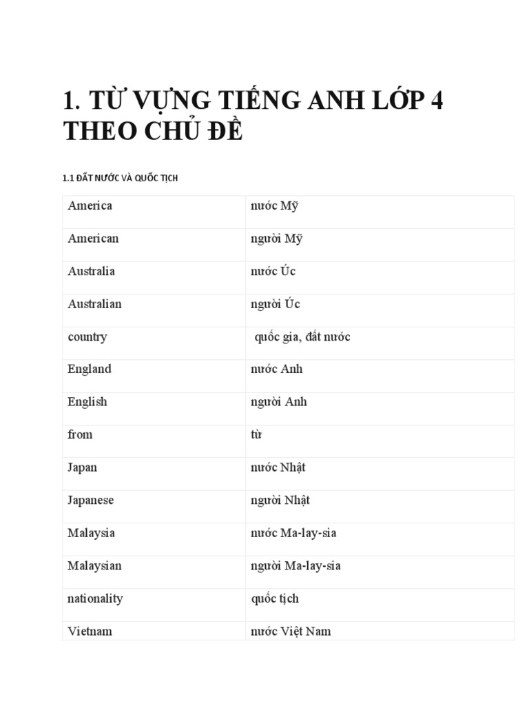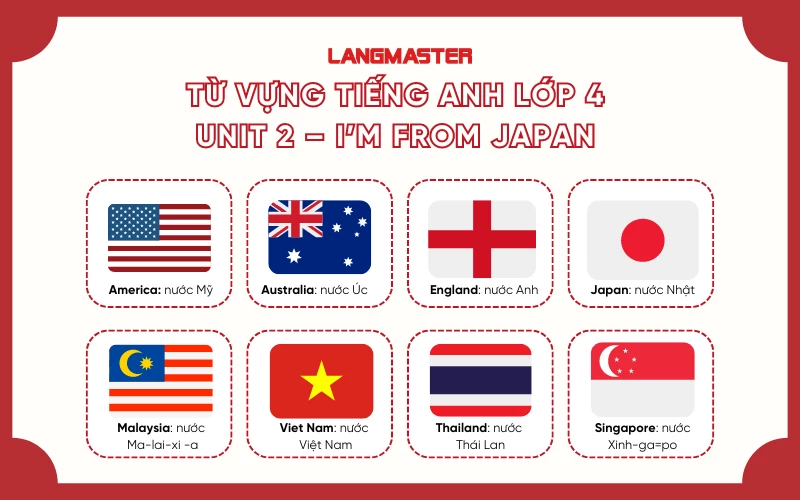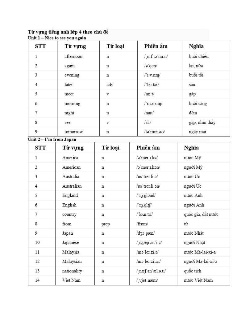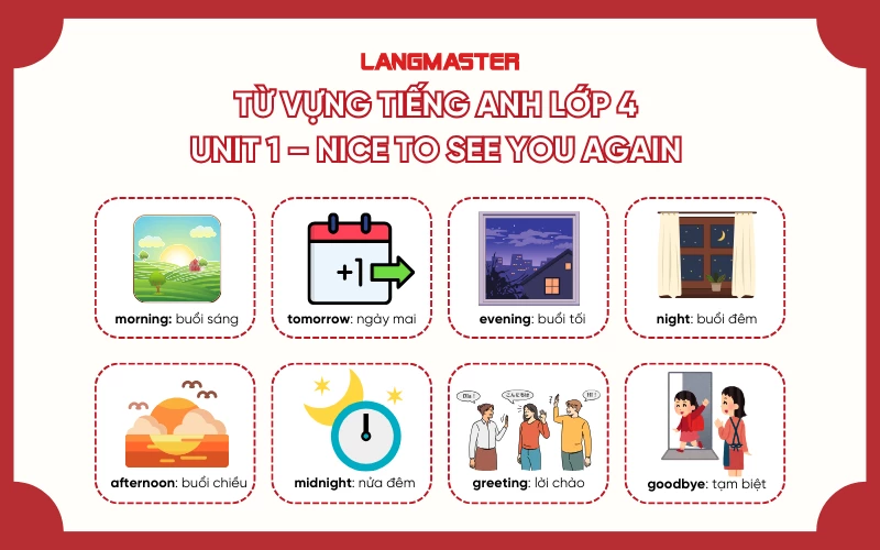 Trong chương trình học tiếng Anh lớp 4, các em sẽ được khám phá một kho từ vựng phong phú và hữu ích qua từng đơn vị bài học. Từ Unit 1 “Nice to see you again”, các bạn nhỏ sẽ làm quen với những câu chào hỏi thân thiện, giúp xây dựng mối quan hệ bạn bè. Tiếp theo, Unit 2 “I’m from Japan” giới thiệu về quê hương và quốc tịch, tạo cơ hội cho học sinh tìm hiểu về văn hóa các nước.
