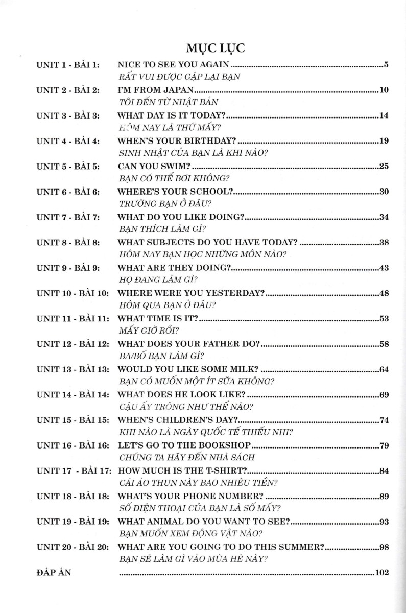 Unit 3 với chủ đề “What day is it today?” giúp các em nắm bắt các ngày trong tuần, từ đó dễ dàng hơn trong giao tiếp hàng ngày. Cuối cùng, ở Unit 4 “When’s your birthday?”, các em sẽ nói về ngày sinh nhật của mình và bạn bè, một hoạt động rất thú vị mà ai cũng thích.