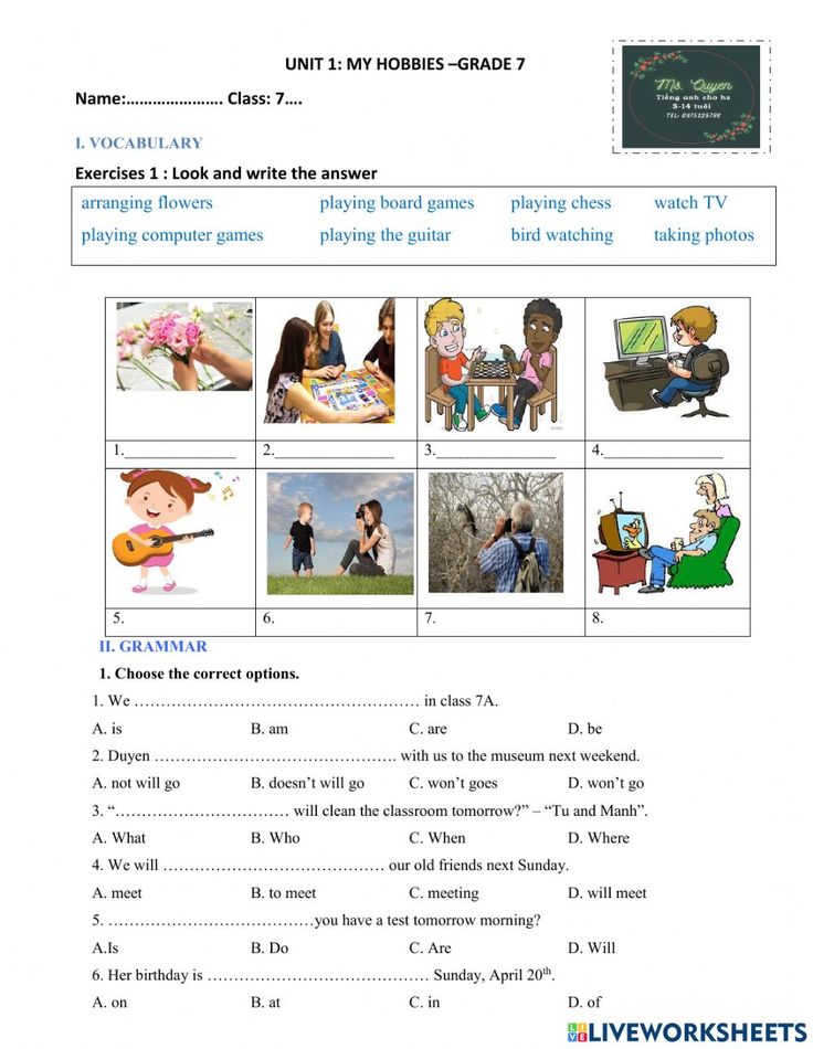 Trong bài học Tiếng Anh lớp 7 Unit 1 với chủ đề Hobbies, chúng ta đã được khám phá nhiều sở thích hấp dẫn khác nhau và ý nghĩa của chúng trong cuộc sống hàng ngày. Các hoạt động như làm vườn, đạp xe hay chế tạo mô hình không chỉ mang lại niềm vui mà còn giúp chúng ta phát triển kỹ năng và tính kiên nhẫn. Khi tham gia vào các sở thích này, chúng ta cũng có cơ hội để thư giãn và giảm căng thẳng.