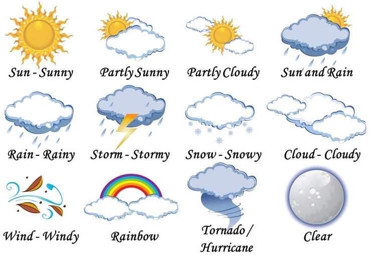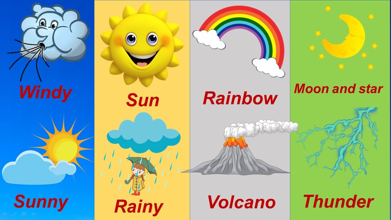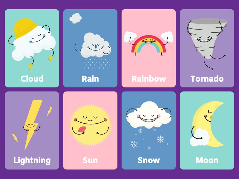 Việc học từ vựng tiếng Anh về thời tiết cho trẻ em thực sự trở nên thú vị với những hình ảnh minh họa sinh động. Các bức tranh mô tả các hiện tượng thời tiết như mưa, nắng, bão giúp bé dễ dàng hình dung và ghi nhớ từ vựng. Khi nhìn thấy hình ảnh, bé có thể tự hỏi: “What’s the weather like today?” và thực hành trả lời với những câu đơn giản như “It’s sunny” hay “It’s cloudy.”