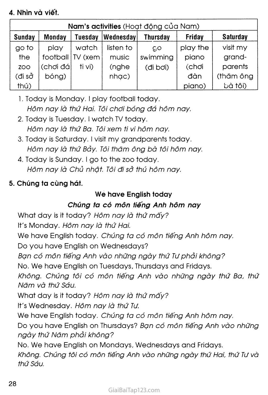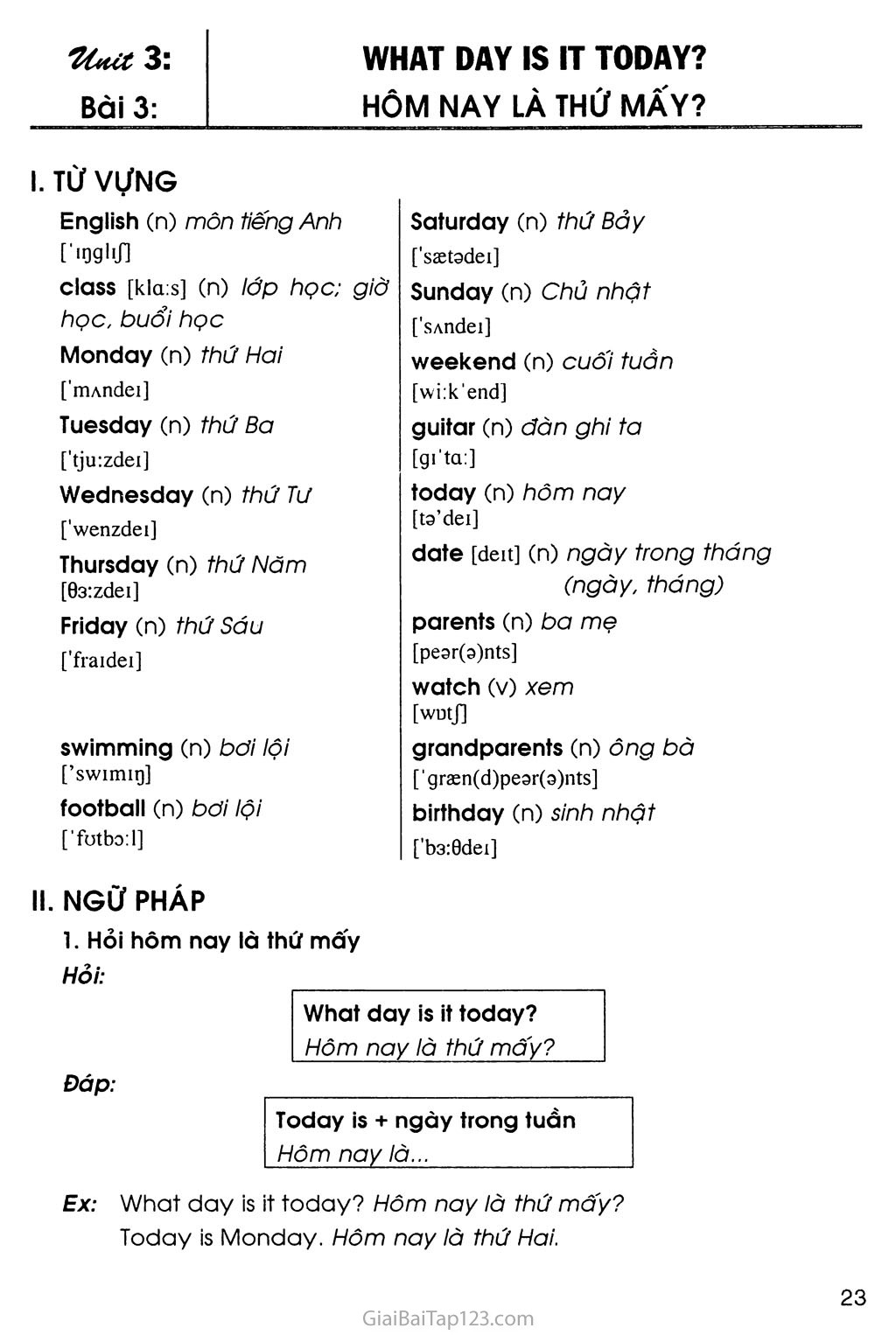 Trong bài học tiếng Anh lớp 4, Unit 3, chúng ta được giới thiệu một câu hỏi rất thiết thực: “What day is it today?” (Hôm nay là thứ mấy?). Đây là cách để chúng ta biết ngày hôm nay là ngày nào trong tuần. Ví dụ, khi Nam hỏi Bình, “What day is it today?”, Bình nhanh chóng trả lời “It’s Wednesday” (Hôm nay là thứ Tư). Qua câu hỏi này, chúng ta có thể dễ dàng hiểu và sử dụng trong các tình huống giao tiếp hàng ngày.