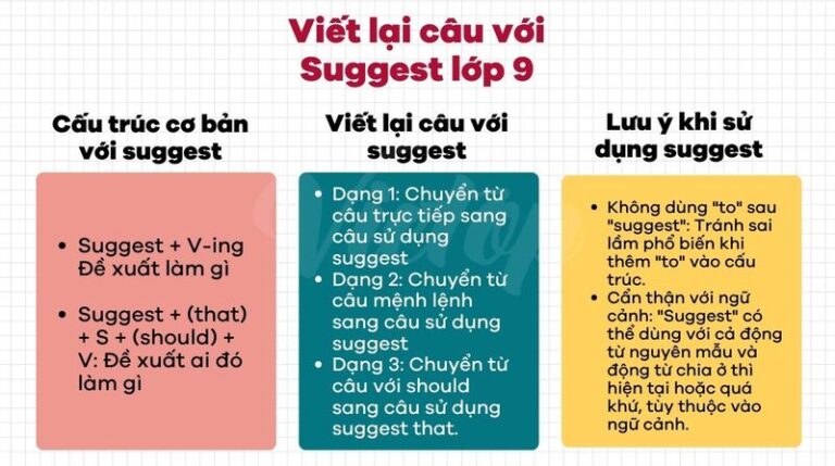 Trong quá trình học tiếng Anh, viết lại câu là dạng bài tập quen thuộc giúp người học nâng cao khả năng sử dụng ngữ pháp, đặc biệt là với các cấu trúc diễn đạt lời khuyên như “suggest”. Tuy…
